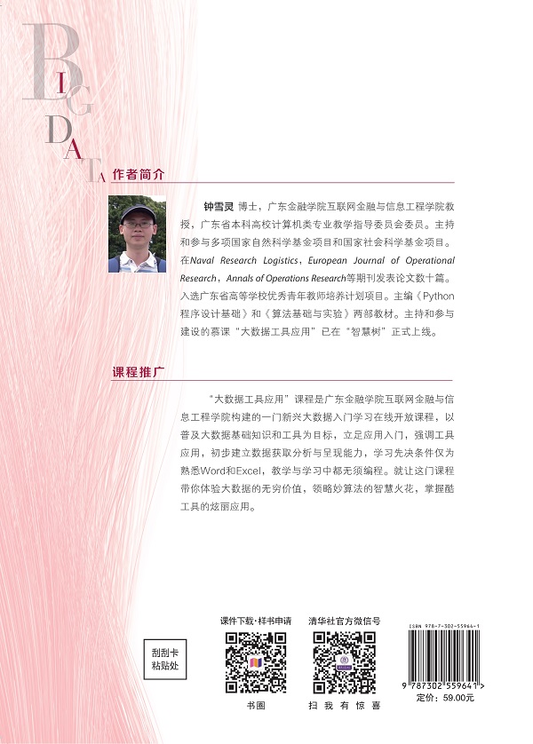 钟雪灵,博士,广东金融学院互联网金融与信息工程学院教授,副院长。主持和参与多项国家自然科学基金项目和国家社会科学基金项目。在Naval Research Logistics,European Journal of Operational Research等期刊发表论文数十篇。主编《Python程序设计基础》和《算法基础与实验》两部教材。主持《大数据工具应用》在线开放课程。
