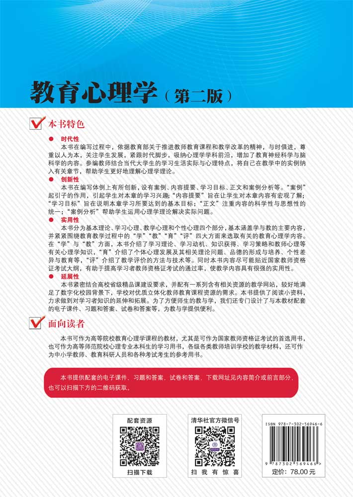 创新性。《教育心理学(第二版) 》在编写体例上有所创新,设有案例、内容提要、学习目标、正文和案例分析等。“案例”起引子的作用,引起学生对本章的学习兴趣;“内容提要”旨在让学生对本章内容有宏观了解;“学习目标”旨在说明本章学习所要达到的基本目标;“正文”注重内容的科学性与思想性的统一;“案例分析”帮助学生运用心理学理论解决实际问题。