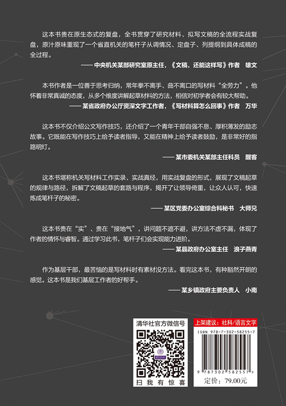 可以说,市面上还没有这样一本公文写作书。 它对文稿起草的全过程原原本本进行复盘(比如对代拟省长讲话稿等文稿进行实战复盘),给人以直观启发和感悟;它对作者日常公文写作积累进行了程序化分解,讲解平时应如何聚焦实战进行广泛积累储备;它对机关公文常用词句进行了分类呈现,供笔杆子们在谋篇布局、开拓思路、搭建框架时查阅,以节省遣词造句时间。 这本书的特色就是实战性强,它不讲太多大道理,主要是复盘一线写手的原生态实战过程和技法。它适用于机关、企事业单位等从事文字工作的人员,高校等科研院所从事公文研究的专家学者,备考机关公务员、事业单位、国企笔(面)试的考生。 希望正浏览本书的你,早日成为一域一地的笔杆子!