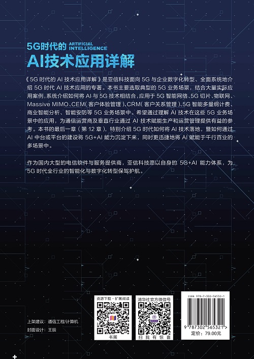 本书结合大量实际案例,全面且详细地介绍了企业在5G时代应该如何应用AI技术来提升 生产、运营和管理能力。全书共分为三篇:第一篇为基础与网络篇,包括第1~4章,主要介绍 如何将AI技术应用于网络智能切片、物联网和5G网络多量纲计费业务场景中;第二篇为客户 与管理篇,包括第5~8章,以客户体验管理、客户关系管理、企业业务流程管理、企业商业智 能决策四大典型应用场景为例,详细介绍如何通过AI技术提升企业的管理效能;第三篇为运维 与安全篇,包括第9~12章,其中第9~11章分别介绍AI技术应用于网络智能运维、机房智 慧管控、智能安防的应用案例,第12章则对AI能力平台化的建设、沉积等内容进行详细论述, 并给出AI平台建设的理念、功能设计和技术设计建议。 本书可供通信行业和其他行业的IT从业人员,以及科研人员、高校师生阅读和参考。