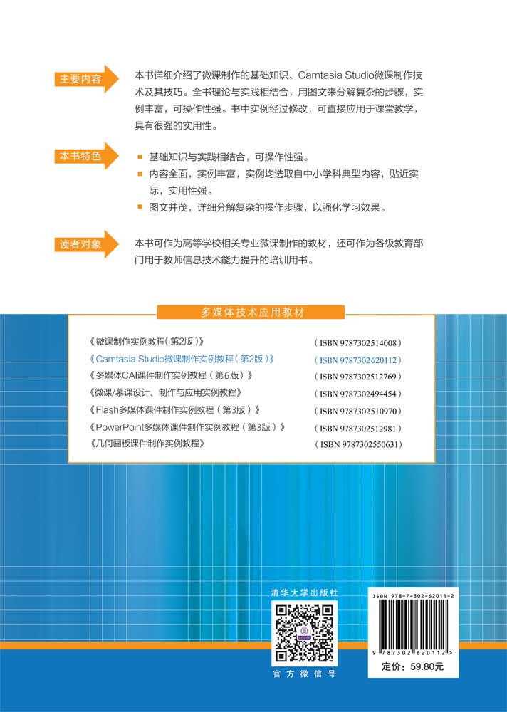 基于微课的翻转课堂教学已在中小学迅速普及,它满足了学生个性化学习的需要。微课制作逐渐成为中小学教师必须掌握的基本教育技术之一,而Camtasia Studio则是目前最常用的微课制作软件。《Camtasia Studio微课制作实例教程(第2版)(微课版)》从微课制作的理论基础知识出发,通过中小学各学科的典型微课实例,详细介绍了使用Camtasia Studio制作微课的相关技术与技巧。全书理论与实践相结合,图文并茂,资源丰富,易教易学。 《Camtasia Studio微课制作实例教程(第2版)(微课版)》可作为高等院校教育技术通识教材或相关专业微课制作教材,也可作为教育部门各级各类相关教育技术培训参考用书,还可作为中小学教师提升教育技术的自学用书。