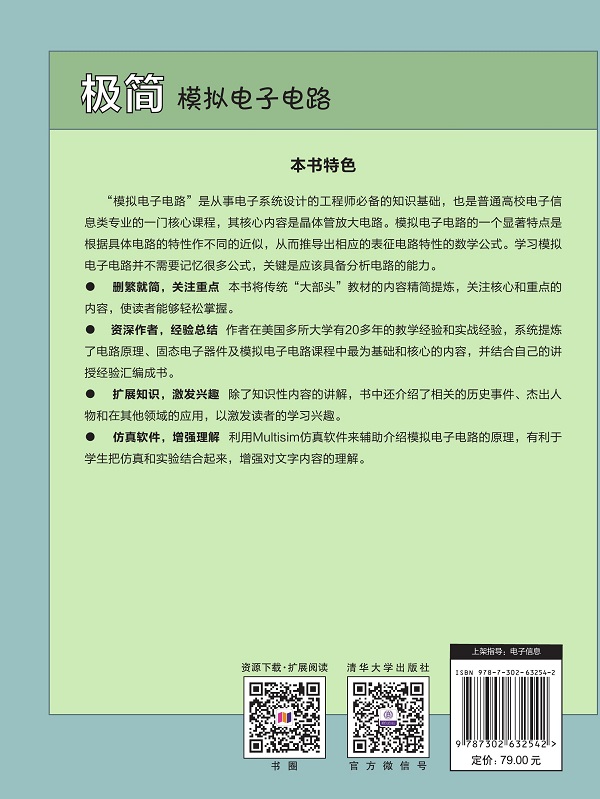 《极简模拟电子电路》基于Multisim仿真软件,系统介绍了模拟电子电路的主要内容,简单介绍了半导体物理和主要的半导体器件,包括二极管、双极型晶体管、MOS场效应晶体管。全书共7章: 第1章为直流电路,介绍了欧姆定律、基尔霍夫定律、焦耳定律、戴维南和诺顿定理、线性叠加原理; 第2章为交流电路,介绍了电阻/电容/电感的交流响应、相量方法的原理和使用、功率分析、一阶滤波器、带通和带阻滤波器、谐振电路;第3章为暂态电路,介绍了电容和电感的模型和时域分析、二阶系统的暂态过程、拉普拉斯变换及其应用; 第4章为半导体器件,介绍了半导体能带、本征和掺杂半导体、载流子的输运过程、不同偏置状态下的pn结、双极型晶体管、MOS场效应晶体管; 第5章为放大电路基础,介绍了逻辑门电路、基本放大电路和放大器的参数、简单和稳定的直流偏置电路、二极管和晶体管的模型、三种基本放大电路、放大电路的低频和高频响应; 第6章为反馈电路,介绍了基本的反馈系统、运算放大器、负反馈电路、敏感性和失真分析、阻抗调节、主动滤波器、数字正反馈电路、维恩电桥振荡器、三点式LC振荡器、负阻LC振荡器; 第7章为差分放大器,介绍了简单的差分放大器、镜像电流源、有源负载、垂直级联放大器、多级放大器、主导极点补偿、反馈补偿。 《极简模拟电子电路》可作为学生或者开发人员学习模拟电子电路的入门用书,也可作为从事电子电路设计开发的工程技术人员的参考书,还可作为高等院校电子信息类专业相关课程的教材。