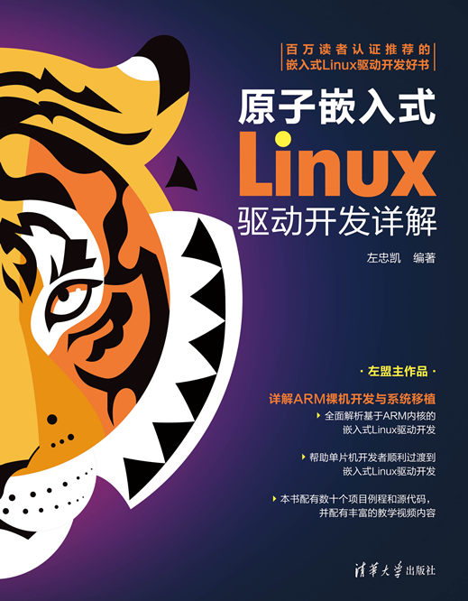 嵌入式 Linux涉及的知识点很多,对初学者的基础要求高,在知识储备的广度和深度上都对学习者提出了很高 的要求。大多数转型嵌入式 Linux开发的朋友都是以前从事单片机开发工作的工程师,因此如何从单片机开发工 程师转型为嵌入式 Linux开发工程师,这个过程非常重要。 单片机 工 程 师 大 多 数 都 是 在 Windows环 境 下 工 作,使 用 集 成 IDE 编 写 并 编 译 代 码,然 后 在 IDE 上 通 过 DownLoad按钮一键下载代码到单片机中。至于集成IDE是怎么组织源文件,又是怎么编译的并不清楚。 本书就以单片机工程最熟悉的“裸机”开发为例,讲解如何在 Ubuntu下搭建开发环境,如何使用 VScode编写程 序,如何使用 make工具编译源码。通过这些操作,大家就可以对集成式IDE与开源开发环境有很清晰的认识。当 掌握了开发方式以后,剩下的就是通过大量的裸机案例来加深对I.MX6ULL 这颗芯片的认识,了解各个外设的应 用,为后面学习嵌入式Linux驱动开发打下坚实的基础。本书后半部分详细讲解了如何移植uboot、Linux内核、根文件 系统,最终在开发板上搭建出一个基础的嵌入式 Linux系统,后续的嵌入式 Linux驱动开发就在这个小系统上进行。 本书可作为广大从事嵌入式开发、MCU 开发、物联网应用开发等工程技术人员的学习和参考用书,也可作为高 等院校计算机、电子、自动化等专业嵌入式系统、微机接口、物联网、单片机等课程的教材。