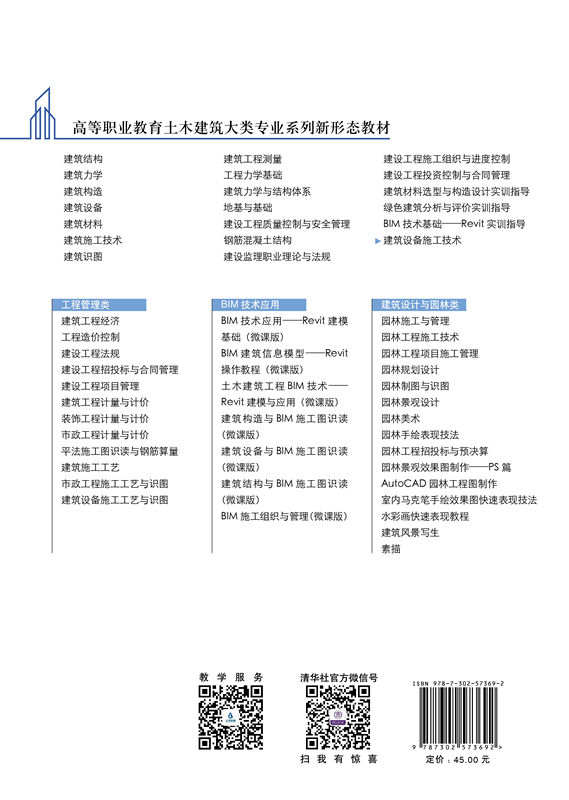 本书是高职院校建筑设备类专业(建筑设备工程技术专业、供热通风与空调工程技术专业、 建筑消防技术专业)的专业方向课程教材, 也是工业设备安装工程技术专业、给排水工程技术专业、制冷与空调技术专业的拓展课程教材。 内容包括: 建筑设备工程常用材料及机(工)具; 建筑给水排水系统安装; 建筑采暖系统安装; 建筑通风系统安装; 建筑空调系统安装; 管道设备的防腐与绝热; 专业训练。本书可以作为高职院校建筑设备类专业师生的教材或参考书,也可以作为“1+X”建筑信息模型(BIM)职业技能等级考试人员的学习用书,同时还可以作为施工现场相关专业人员的指导用书和实用手册。