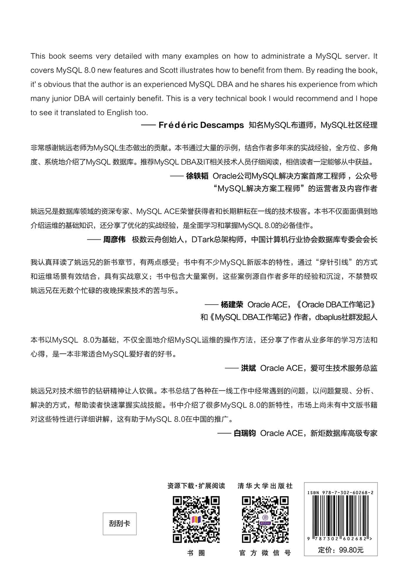 前言 写这本书的原因 MySQL是世界上排名第一的开源数据库,实际上,MySQL加上其分支已经超过了Oracle数据库的排名,成了事实上的业界王者。自从2009年Oracle公司通过收购SUN公司将MySQL置于旗下后,MySQL数据库的发展更加迅猛,特别是MySQL 8.0版本的推出,使MySQL数据库和其他开源数据库的差距进一步拉大。在开源数据库越来越流行的今天,学习MySQL数据库成了很多数据库爱好者的首选。 我从21世纪初开始使用MySQL数据库,刚开始做开发,后来做运维。和很多MySQL的爱好者一样,我在遇到问题时喜欢从网上搜索答案,但这样得到的知识是碎片化的,要想真正精通MySQL必须进行系统、全面的学习。我学习MySQL的资料来源主要有两个: 第一个来源是MySQL的官方文档,但MySQL数据库的官方文档和Oracle数据库的官方文档比起来相当简陋,很难让人相信是出自同一家公司之手; 第二个资料来源是MySQL方面的书籍,我基本上把国内所有的Oracle和MySQL的书籍都看过了。感觉MySQL方面的中文书还是太少,特别是涉及MySQL 8.0新特性和优化方面的书籍更少。于是我在学习过程中就萌生了一个想法,要自己写本MySQL方面的书,为开源数据库在中国的推广做点贡献。 这些年来,我不断地把自己实际工作中积累的经验整理成对外的博客和对内的工作笔记。随着自己博客和工作笔记的积累,再加上在广州鼎甲公司和互联网上的授课,输出一本MySQL的书就成为水到渠成的事情了。 这本书中的很多内容是我工作经验的总结,例如,我在工作中处理最多的故障是MySQ...