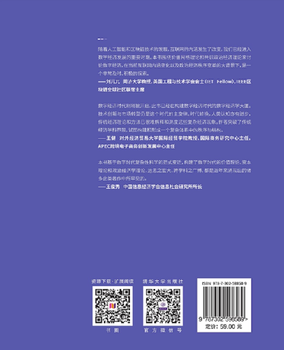 本书力求通过跨学科研究的方式探索智能经济时代数字经济运行的基本逻辑,通过融合复杂经济学、信息哲学、计算机科学、社会学、政治学等多个学科的思想,构建了价值网络理论、数字经济资本论及共识政治经济理论的核心知识体系,帮助读者建立理解信息科技和智能文明大格局的经济学视角的基本框架。 本书深入浅出,主要面向从事数字经济领域的专业工作者,包括企业、政府和智库中从事相关研究的人员,对于非该领域的专业人士也可以通过此书了解数字经济学这门新兴学科的现状,同时也可作为高校的教材或参考读物。