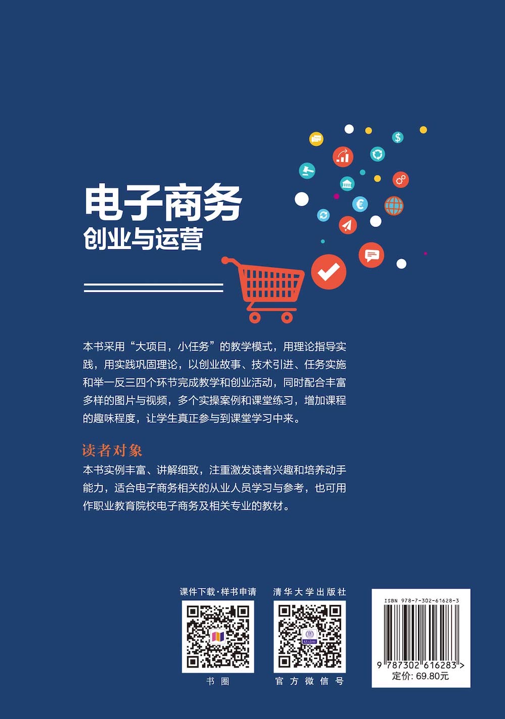 前言 《电子商务创业与运营》是为了响应国家号召,壮大创新主体,推动教育创新,改革人才培养模式,让学生能够快速掌握电子商务行业创新与创业的技巧和能力,提高电子商务营销和运营能力而作,旨在培养学生表现与表达能力的同时,使其能够多维度地了解整个电子商务行业创业与营销概况,掌握电子商务行业知识,为日后从事电子商务相关职位或独立创业打下基础。 《电子商务创业与运营》内容 《电子商务创业与运营》共9章:第1章 产业链与电商平台;第2章 店铺品牌定位;第3章 产品的选择;第4章 最小可行化产品;第5章 店铺的设计与装修;第6章 设计产品详情页和海报;第7章 电商平台流量营销;第8章 用户裂变营销;第9章 电商运营数据管理。 每章都包括专业知识导入和创业活动,学生可以在学习专业知识的同时为从事创业活动打下基础。每个创业活动包括创业故事、技术引进、任务实施和举一反三四部分,帮助学生循序渐进地完成课程内容学习。学生可以通过完成课后习题中的选择题或填空题,检测学习效果。创新实操可以使学生脱离教学,具备独立操作的创新能力。 创业故事 以第一人称的方式讲述电商创业人创业的过程。让学生了解电商创业的条件和流程,并从别人的创业活动中吸取经验,避免犯同样的错误。 技术引进 主要针对本创业活动中涉及的理论知识进行全面详解,由理论引导实践,降低活动的实施难度。 任务实施 学生根据活动内容和要求完成指定的创业活动;教师通过课堂观察、书面测验、口头测验、课堂提问、作业分析、学员访谈和过程记录等形式,对学生任务实施情况进行打分,检查学生学习情况,进行查缺补漏。 举一反三 通过举一反三环节...