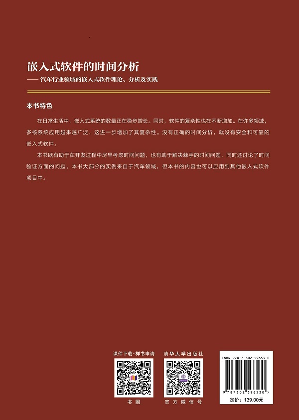 序 言 在计算机科学这个领域中,嵌入式软件仅占相对较小的一部分。其中,“运行时间分析”主题是该学科中的一个特定方面。那么,“嵌入式软件的时间分析”只是一个仅与少数专家相关的主题吗? 目前,全世界所使用的嵌入式系统多达数十亿个。所有这些设备都运行着嵌入式软件,并且每个系统都有自己的一套时间需求。如果由于软件错误而无法满足这些时间需求,结果可能天差地别。根据产品和具体情况,产生的后果可能让人难以察觉,也可能对用户造成困扰,甚至危及生命。 深入了解嵌入式系统所面临的时间分析挑战,有助于开发更好、更可靠的嵌入式软件。这不仅能提升系统的安全性和可靠性,还可以在整个开发生命周期中节省大量成本。这些并不是口头上说说而已,在本书第6 章中讲述的许多实例就能得到验证。成本节省在开发的各个阶段均可能实现。 ? 在嵌入式系统及其软件的设计中,尽早考虑时间问题对提高开发效率具有的决定性作用,并且可以避免从一开始就出现时间问题。 详细介绍在本书的3.3 节、6.2 节、8.1 节和第9 章。 ? 如果在应用开发中使用了正确的时间分析技术也可以节省时间和资金。本书第5 章概括地介绍多种不同的技术。每种技术都有其适用的项目开发阶段,并在各自的介绍中描述其工作原理及流程,其中重点介绍了应用和局限性。另外,除了这些描述以外,第5 章还包含了相应领域专家的访谈记录。这使主题更加鲜活,并提供了一定的客观性。如果项目已经出现了严重问题,尤其是在发生了严重时间问题的情况下,在合适的阶段使用相应的时间分析技术将会提供巨大帮助。 ? 自动化测试有助于节省成本,这一点不言而喻。但是,现有的自动化测...