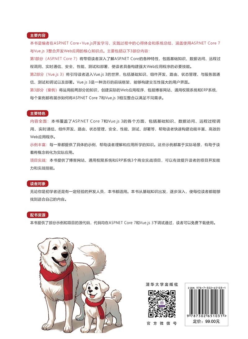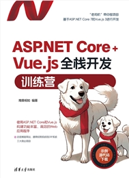 《ASP.NET Core+Vue.js全栈开发训练营》旨在为读者提供一个全面、实用的学习资源,以掌握使用ASP.NET Core 7和Vue.js 3构建功能丰富、高效的Web应用程序的技能。本书分为3部分。第1部分(第1~9章)主要介绍ASP.NET Core的相关内容,包括基础知识、数据访问、远程过程调用、实时通信、安全、性能、测试和部署,这些是构建强大Web应用程序的必要知识。第2部分(第10~17章)主要介绍Vue.js 3的相关内容,包括基础知识、组件开发、路由、状态管理、与服务器通信、测试和调试以及部署;Vue.js 3是一种流行的前端框架,能够构建交互性强大的用户界面。第3部分(第18~20章)是结合ASP.NET Core和Vue.js 3,创建实际的Web应用程序案例,包括博客网站、通用权限系统和ERP系统。 《ASP.NET Core+Vue.js全栈开发训练营》内容全面、示例丰富,对ASP.NET Core+Vue.js 3框架的初学者来说,是一本简明易懂的入门书和工具书;对从事Web前端开发的读者来说,也是一本难得的参考手册。同时本书也适合作为高等院校和培训机构计算机相关专业的教材。