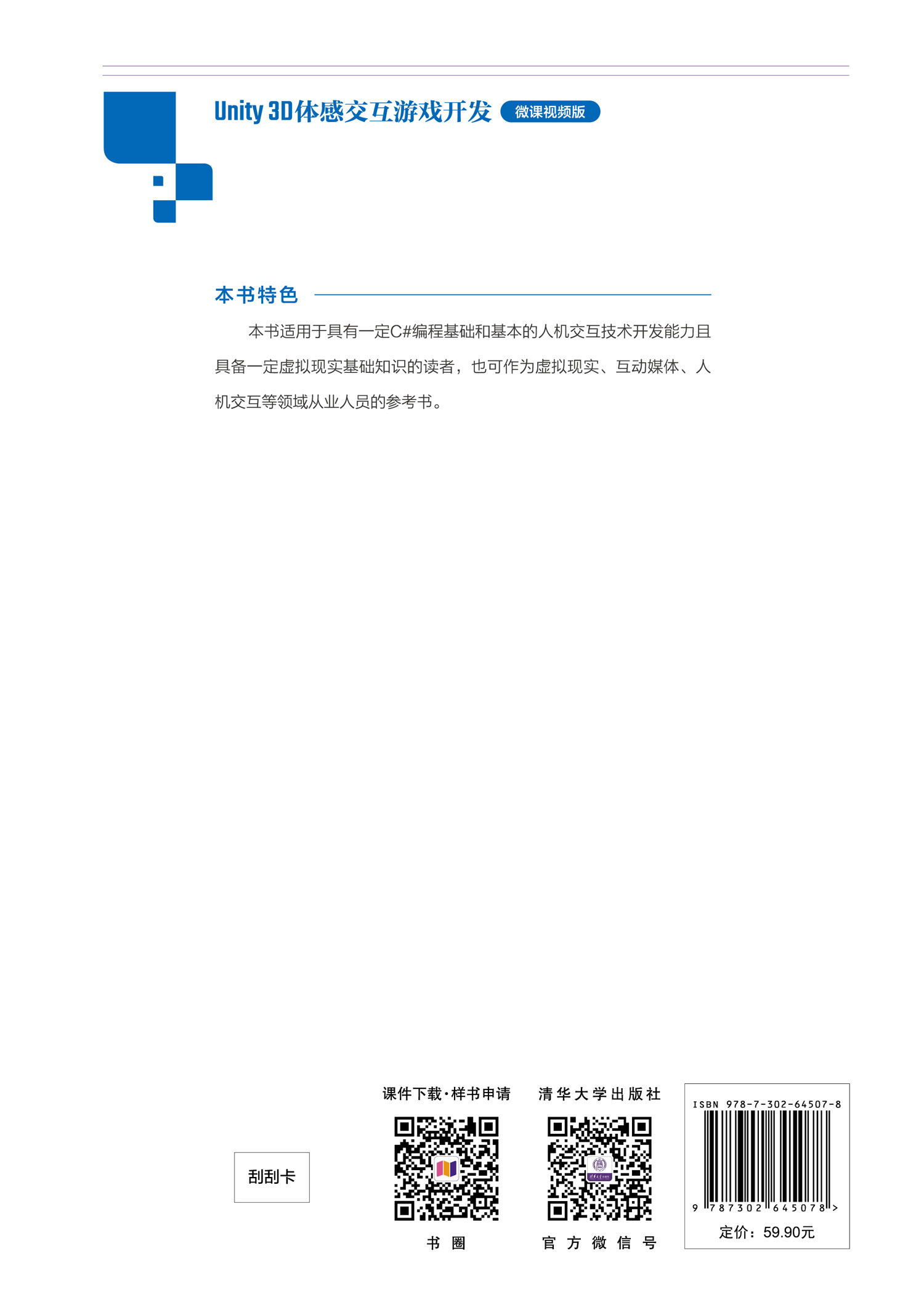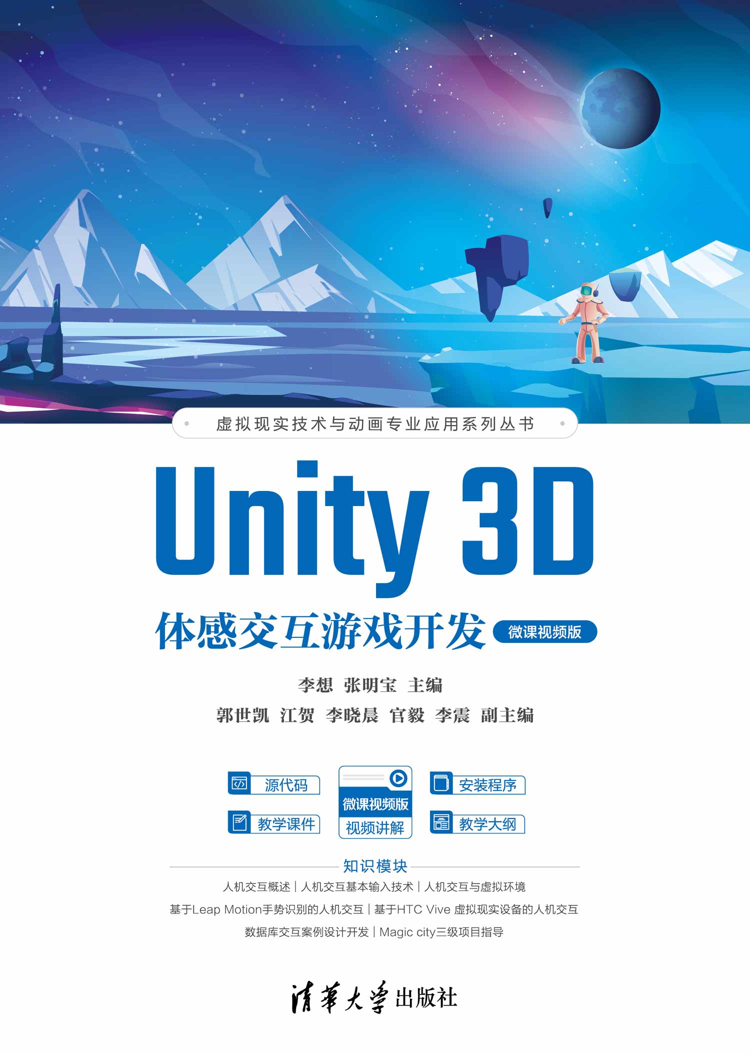 本书重点介绍Unity 3D、Leap Motion和HTC Vive三种技术。Unity 3D是**的游戏引擎,本书采用兼容性好、扩展性丰富的Unity 3D(2020.3.30版本)引擎来进行案例的设计开发。在开发人机交互产品和系统方面,Unity 3D不仅能够整合代码和设计,而且能够将操作窗口可视化,实时地进行画面的更新和数据的显示,Unity 3D还能够支持虚拟现实设备(如HTC Vive虚拟现实套装)、体感交互设备(如Leap Motion体感交互设备)等设备的运行,并支持对应虚拟现实技术与体感交互技术的开发,将传统的人与计算机键盘、鼠标控制显示内容和文本的互动,转变为更多的自然交互形式,体现形态也由2D扩展到3D可视化的终端显示。 本书适用于具有一定C#编程基础和基本的人机交互技术开发能力且具备一定虚拟现实基础知识的读者,也可作为虚拟现实、互动媒体、人机交互等领域从业人员的参考书。