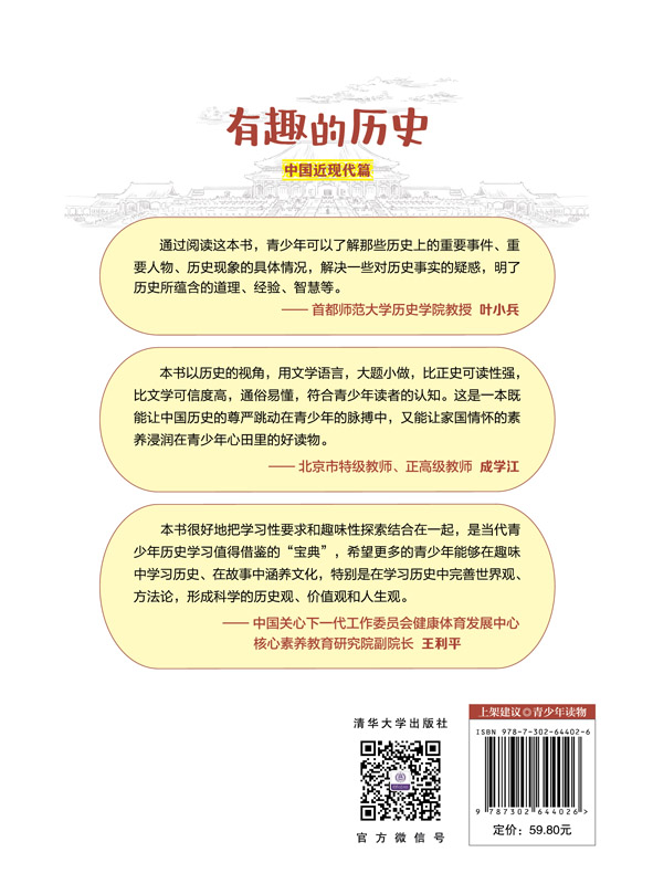 《有趣的历史:中国近现代篇》共有六章,既突出了历史进程的时序性,又凸显了历史发展的主线。借助真实、有趣、鲜活的故事讲述了从鸦片战争到改革开放后的中国近现代历史。为了使读者更宏观、更准确地了解历史事件的来龙去脉,《有趣的历史:中国近现代篇》还设有辅助小栏目,既有助于读者从历史深处解读历史,又可以拓展读者的思维广度,培养历史学科的核心素养。 通过《有趣的历史:中国近现代篇》,读者能够体会历史本身的趣味和意义。同时,《有趣的历史:中国近现代篇》通过构建历史与当下的联系,可让青少年立足当今,放眼世界,有助于形成正确的价值观和国际视野。 《有趣的历史:中国近现代篇》适合青少年阅读,同时对普通历史爱好者也具有较高的参考价值。