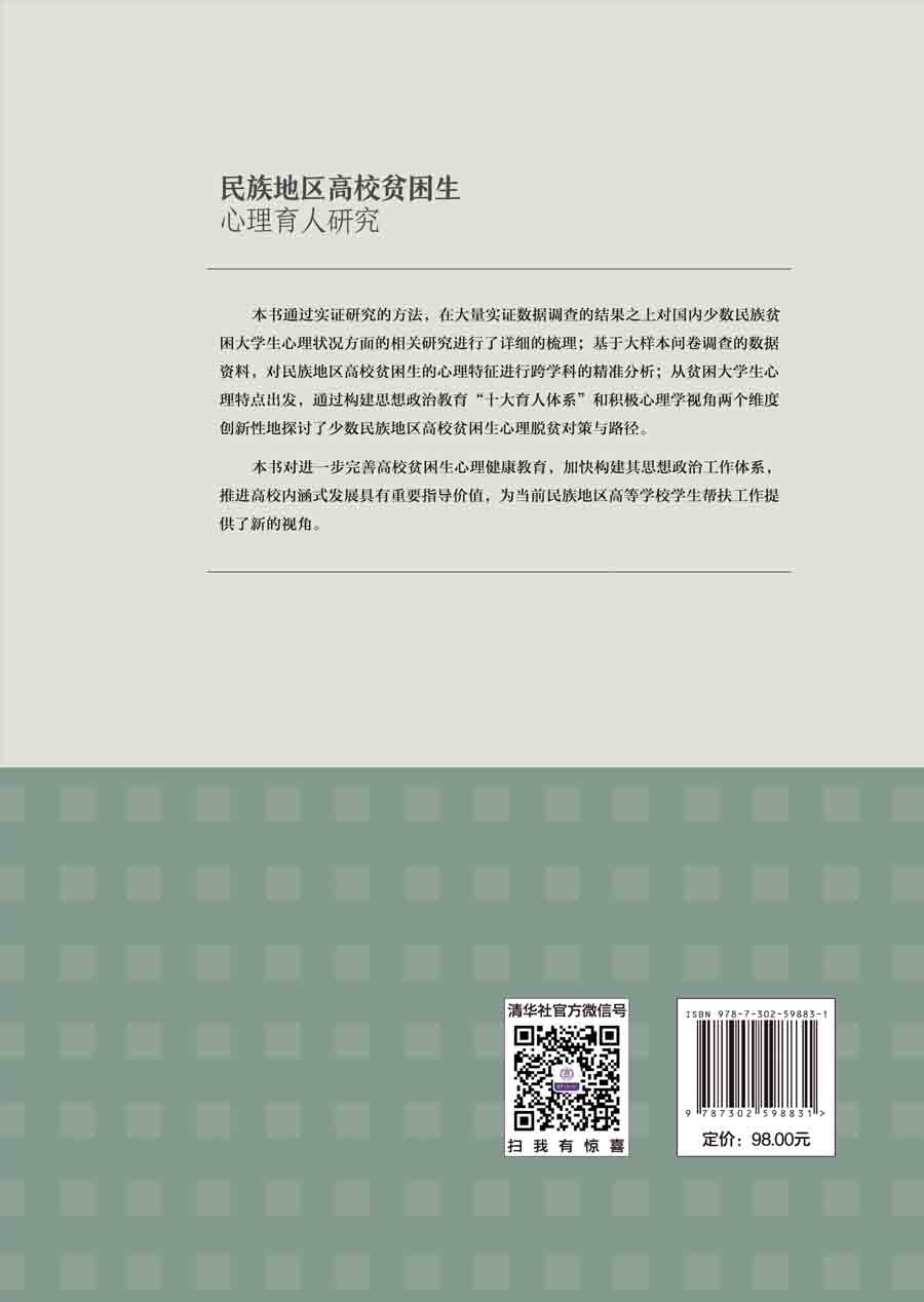 本书通过实证研究的方法,在大量实证数据调查的结果之上扩充了贵州少数民族地区高校贫困大学生社会心理状况的相关研究领域,详细明确了少数民族地区高校贫困大学生社会心理状况的具体表现特点,结构清晰、内容全面、题材丰富、构思巧妙,并通过深层次统计研究方法创新性探究明晰了社会支持、核心自我评价等积极心理变量对贫困大学生心理健康状况的具体影响机制及微观路径,阐明该领域研究的重要性与必要性,为今后少数民族地区高校贫困大学生德育工作的开展提供了理论和实践依据,对高校进一步完善贫困大学生心理育人,加快构建贫困大学生思想政治工作体系,推进高校内涵式发展具有指导价值。