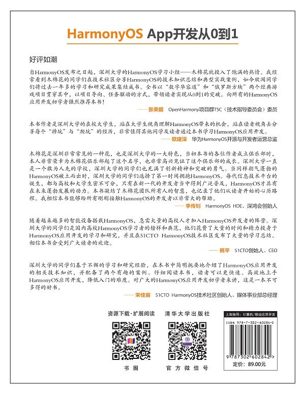 本书系统阐述了HarmonyOS开发基础知识。 全书共分为8章:第1章为HarmonyOS的概述,第2、第3章为HarmonyOS的开发准备和基础知识,第4、第5章为HarmonyOS开发的完整案例,第6-8章为HarmonyOS的进阶开发。书中主要内容包括:HarmonyOS技术特性、Page Ability、生命周期、UI框架、真机调试与运行、分布式调度、分布式迁移与回迁、轻量级偏好数据库、分布式数据库。 书中包含大量的应用市例,不仅可以学会理论知识还可以灵活运用。书中通过多个完整的案例详细阐述了如何在HarmonyOS操作系统上开发App,内容完整、步骤清晰。 本书可作为HarmonyOS开发初学者的入门书籍,也可作为从事HarmonyOS开发的技术人员及培训机构的参考书籍。