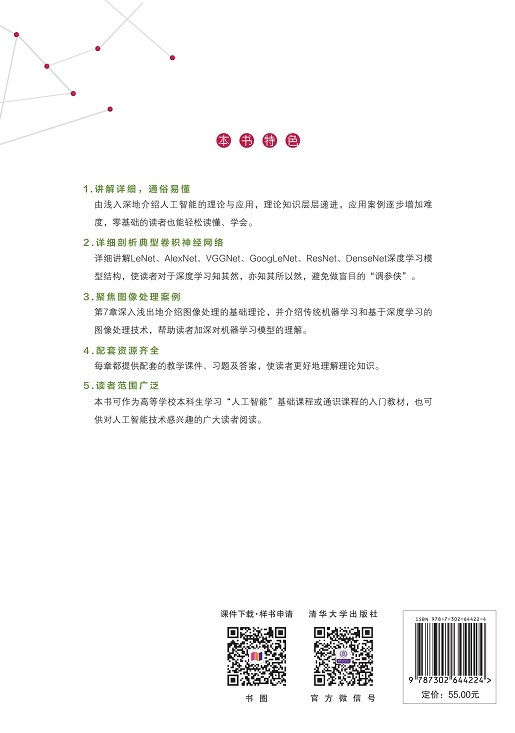 本书介绍人工智能的基础理论、技术及应用。全书共9章,主要内容包括人工智能概述、知识表示与知识图谱、搜索策略、机器学习、人工神经网络、典型卷积神经网络、智能图像处理、机器学习开发框架、机器学习项目剖析。本书强调理论联系实际,既深入浅出地介绍了人工智能领域的基础知识和实用技术,又详细介绍了两个机器学习开发框架: PyTorch和百度公司研发的PaddlePaddle(飞桨),并带领读者逐步剖析在飞桨平台上实现的项目案例。案例的代码清晰,易于理解,读者可快速提高采用机器学习方法解决实际问题的实践能力。 本书可作为高等学校本科生学习“人工智能”基础课程或通识课程的入门教材,也可供对人工智能技术感兴趣的广大读者阅读。