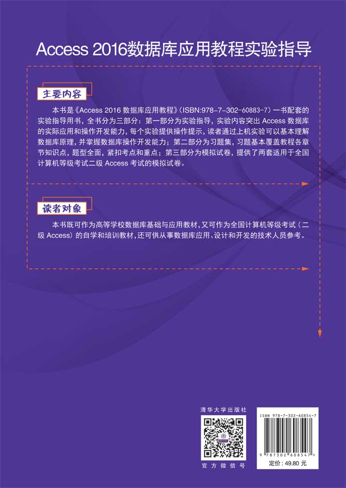前 言 数据库基础知识是当今大学生信息素养的重要组成部分,数据库应用课程是高等学校一门重要的计算机基础课程,不单普及数据管理知识和数据库操作技术,还涉及面向对象编程基础。在物联网和人工智能技术迅速发展,程序设计能力培养已经深入基础教育的今天,数据库应用课程中的程序开发技能显得尤为重要。 《Access 2016数据库应用教程实验指导》是《Access 2016数据库应用教程》(ISBN 978-7-302-60883-7)一书配套的实验指导用书,主要内容包括创建数据库及表、查询设计、窗体设计、报表设计、宏设计、VBA设计和ADO编程,并提供了习题集、两套模拟试卷及其参考答案用于学习者巩固所学知识。 全书主要由三部分内容和附录构成,内容安排如下。 第一部分为实验指导,实验内容突出Access 数据库的实际应用和操作开发能力,每个实验提供操作提示,读者通过上机实验可以基本理解数据库原理,并掌握数据库操作开发能力。 第二部分为习题集,练习题基本覆盖教程各章节知识点,题型全面,紧扣考点和重点。 第三部分为模拟试卷,提供两套适用于全国计算机等级考试二级Access考试的模拟试卷。 附录为参考答案,列出了习题集参考答案和模拟试卷参考答案。 《Access 2016数据库应用教程实验指导》实践性强,题型丰富,适合作为高校计算机等级考试Access 数据库的实践指导书,也可作为相关专业学生学习Access 数据库的辅助性教材。 限于作者水平,书中难免存在疏漏或不妥之处,恳请广大读者批评指正。 《Access 2016数据库应用教程实验指导》提供丰富的配套资源,包...
