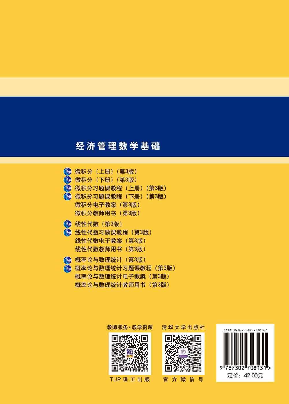第3版前言 经济管理数学基础《线性代数》教材第2版已出版10年了,感谢兄弟院校 的关注和广大同学的使用.在国家推进新文科建设的背景下,根据当前教学形势 的发展及需求,并结合我们近几年的教学研究与教学实践,作者认为有必要对本 教材进行再版修订. 本次修订的指导思想:修订的重点是将纸介质教材与数字资源进行一体化设 计,相互配合、相互支撑,进一步提高教材的适用性和对课程教学的支撑性,形 成新形态教材. 修订的重点内容:配套数字资源,开篇介绍本书的重点知识,每章后面进行 了系统的小结;对重点和不易理解的知识点进行细致讲解;对部分例题和习题中 容易出现的错误及问题,也进行了分析;在每章后针对学习要点增加了综合自测 题;为方便学生自学配备了3套模拟试题及答案;为使用该教材的老师配备了每 章习题的详解和电子教案,供讲课参考.同时修正了第2版中存在的不当之处和 部分习题中的错误,更换了部分例题和习题 参加本书第3版修订工作的有张旭利(第1~2章),孙鹏(第3~4章), 杨柳(第5~6章).本书的电子教案和每章习题详解由孙鹏给与修订,全书由 张旭利统稿.数字资源以二维码形式给出. 在本书的修订过程中,得到教育部首批新文科研究与改革实践项目“新文科 大学数学课程体系和教材体系建设实践”的支持.吉林大学本科生院、吉林大学 数学学院和清华大学出版社给予了指导和帮助,吴晓俐承担了教材修订的编务工 作,在此一并表示衷心的感谢 由于编者水平所限,书中的疏漏和不当之处,敬请广大读者批评指正. 作 者 2025年10月