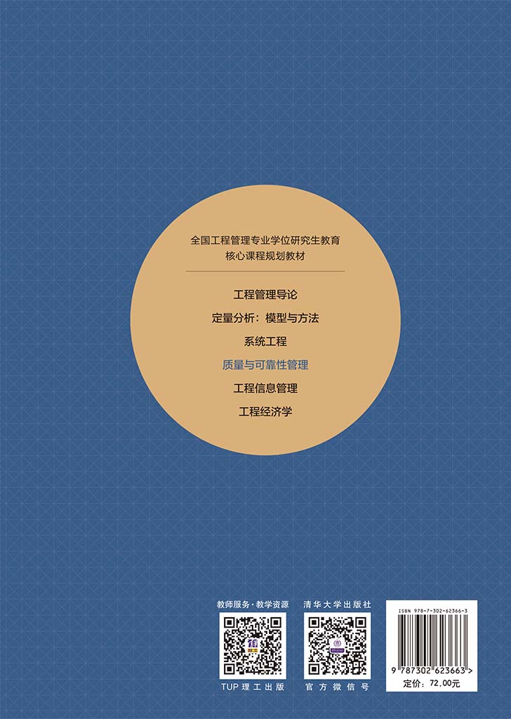 本书系统介绍了质量与可靠性管理的基本概念、质量与可靠性管理体系、质量设计、过程质量控制、质量改进、可靠性模型、可靠性预计与分配、故障分析技术、可靠性试验与分析、系统可靠性评估、维修性管理、安全性管理。在内容上既注重介绍质量与可靠性的基本理论与方法,又力图反应实用性、可操作性和先进性。本书是为工程管理专业学位研究生编写,也可作为工程管理、管理科学与工程、土木工程等专业的本科生或研究生教材,还可供企业和事业单位的从事质量与可靠性管理方面工作的人员学习参考。
