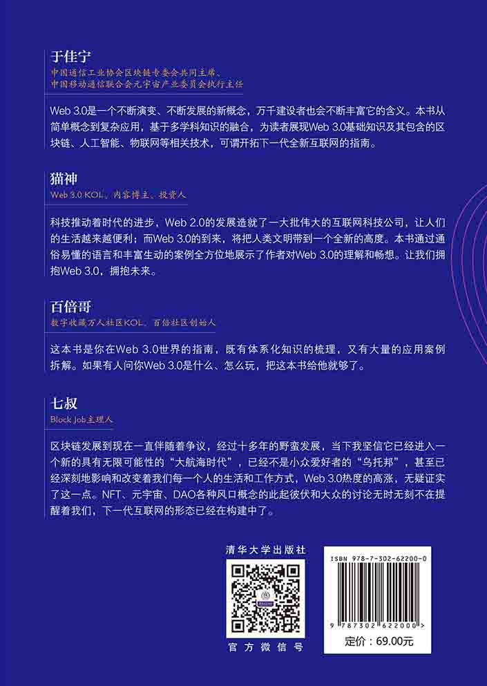 Web3如今作为被市场普遍看好的行业,是未来十年人人都需要了解的。但是另一方面,行业内却缺乏一本专业性和通俗性兼顾的读物。本书从通俗易懂的角度出发,既兼顾了完整性,又能使一个完全不了解web3的人能够读懂。本书分8个部分,主要内容包括web3 的身份证、web3 的公链、解决方案、公链和公链之间的桥梁、DEFI链上经典不可或缺的应用、GAMEFI,web3游戏革命,非同质化代币,web3写作。内容全面,知识性、科技性和专业性都强,文字通俗易懂,适合大众读者阅读。