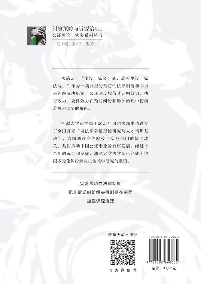 "主编:廖永安,现任湘潭大学党委副书记、教授、博士生导师。兼任教育部高校法学类专业教学指导委员会委员、中国法学会民事诉讼法学研究会副会长、湖南省法学会诉讼法学研究会会长、司法部公证理论研究与人才培训基地主任等职务。系国务院政府特殊津贴专家,入选国家高层次人才特殊支持计划哲学社会科学领军人才、国家百千万人才工程、教育部新世纪优秀人才支持计划,获评国家有突出贡献中青年专家、全国十大杰出青年法学家提名奖(两届)、湖南省优秀社科专家。主要从事诉讼法学、司法制度、纠纷解决等领域的教学研究,主持国家重点研发计划重点专项1项、国家社科基金项目5项(其中重大项目2项),以及其他省部级项目30余项。在《求是》《中国法学》《中外法学》等期刊上发表学术论文180余篇,出版个人专著《民事审判权作用范围研究》等3部,以及主编《中国调解研究文丛》等著作教材30余部。荣获国家教学成果二等奖(2项)、中国法学会法学优秀成果一等奖、司法部全国法学教材与科研成果一等奖、教育部人文社会科学优秀成果三等奖、**检全国检察理论研究成果一等奖等奖励40余项。谢蔚,意大利罗马第一大学法学博士,现任湘潭大学法学院副教授,硕士生导师,法学院党委委员。主要从事民法基础理论、公证法学的教学和科研工作。主持或参与国家社科基金、司法部、省社科基金项目10余项,在《判解研究》《私法研究》《罗马法与共同法》《湖南大学学报》《湘潭大学学报》等中文核心期刊(CSSCI)发表学术论文10余篇,部分论文被《高等学校文科学术文摘》转载。副主编:夏先华,现任湘潭大学法学院讲师,硕士生导师,兼任司法部公证理论研究与人才培训基地专职研究员、珠海市涉外公共法律服务中心公证智库专家。主要从事民事诉讼法学、公证法学的教学研究,主持**人民检察院、省社科评审委员会、省教改等课题10余项,出版个人专著《人身安全保护令制度研究》,参编《诉讼制度改革与理论探索》等著作3部,在《湘潭大学学报》《郑州大学学报》《河北法学》《人民法院报》等报刊杂志发表学术论文近20篇,荣获湖南省教学成果奖一等奖、中国公证改革发展高端论坛一等奖、陈光中诉讼法学优秀博士生奖、优秀博士学位论文奖等奖励10余项。段明,现任湘潭大学法学院副教授、硕士生导师,兼任司法部公证理论研究与人才培训基地秘书长,曾任**人民法院第五批法律研修学者。主要从事民事诉讼、纠纷解决、智慧司法的教学研究,主持国家重点研发计划重点专项子课题、中国博士后科学基金资助项目等课题5项;在《光明日报》《比较教育研究》等报刊发表学术论文30余篇,部分论文曾被《新华文摘》《人大复印报刊资料》转载;出版个人专著《公证债权文书执行研究》,以及合著出版 Mediation and Law in China : Development and Integration等学术专著5部;荣获中国法学会青年论坛二等奖、首届陈光中诉讼法学优秀博士后、湖南省教学成果一等奖等奖励10余项。"
