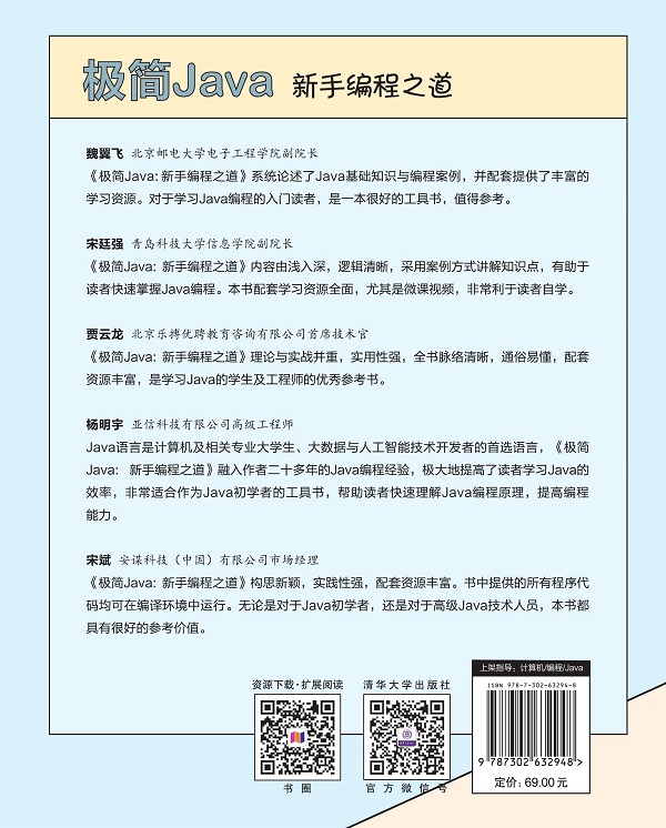 本书系统论述Java编程语言及其实际应用,全书共分为16章: 第1~6章讲解Java基本语法; 第7~ 10章讲解Java面向对象相关知识; 第11~16章讲解Java实用技术。主要内容包括: 编写第一个Java程 序、Java基本语法、Java数据类型、运算符、条件语句、循环语句、面向对象基础、面向对象进阶、常用类、Java 集合框架、Java异常处理机制、I/O 流、图形界面编程、多线程开发、网络编程和MySQL数据库编程。另 外,每章后面都安排了“动手练一练”实践环节,以帮助读者消化吸收本章知识点,并在附录A 中提供了参 考答案。 本书配有教学课件、源代码与微课视频,并提供在线答疑服务,便于读者高效学习,快速掌握Java编程 方法。本书适合零基础入门的读者,可作为高等院校和培训机构的教材。