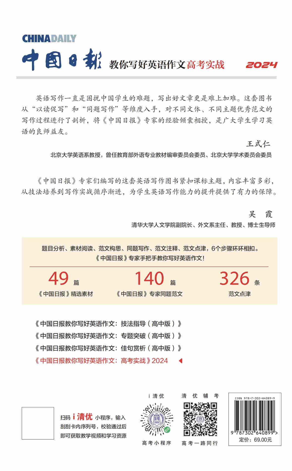 本书由中国日报社21世纪报社组织编写,收录了2021—2023年高考英语全国甲卷、全国乙卷、新高考I&II卷、北京卷、天津卷、上海卷、浙江卷中28个写作题目。主要内容包含题目分析、《中国日报》精选素材、同题范文、范文构思、范文注释、范文点津。题目分析涉及写作要点、谋篇布局、时态选择等角度。《中国日报》精选素材源自China Daily同主题佳作。同题范文由中国日报社21世纪报社多位专家撰写,每个题目提供5篇范文,并设有范文构思、范文注释和范文点津三个栏目,引导学生探索写作过程,深入学习精彩词汇和句式。《中国日报教你写好英语作文:高考实战》可以帮助广大高中学生突破英语写作障碍,并有效提升英语写作技能,进而提高高考英语成绩。