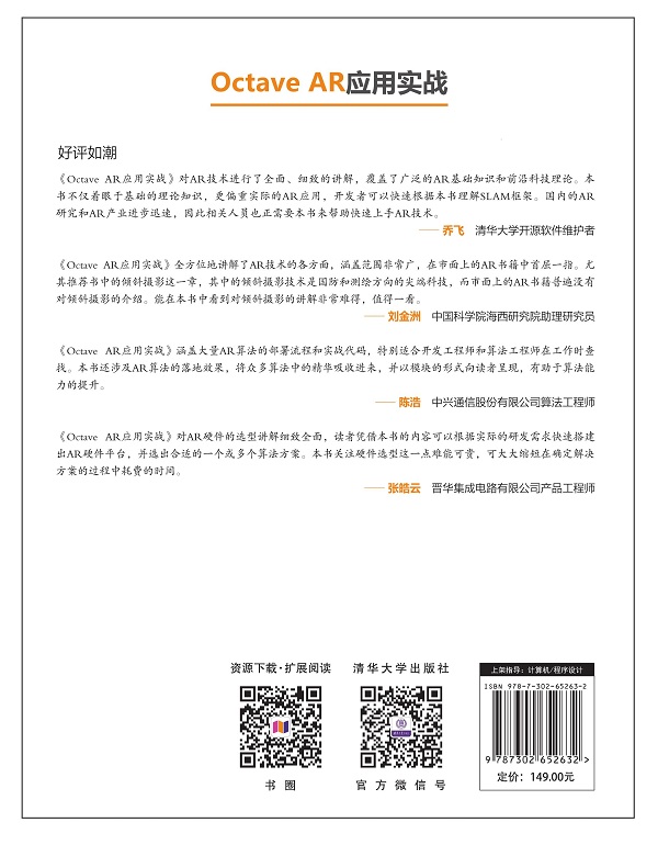 Octave为GNU项目下的开源软件,旨在解决线性和非线性的数值计算问题。本书全面讲解AR技术在理论上的基础和在行业内的应用,帮助读者尽快掌握Octave的应用技巧。 本书共13章,涵盖广泛的AR技术应用场景,将庞大的AR技术分解为可视化技术、计算机视觉、硬件选型、SLAM算法等方面,分类进行详细讲解,并提供大量实用程序示例,让读者不仅可以在学习过程中减小阻碍,在实际的工程研究中也方便查找,内容覆盖全面。 本书针对零基础的读者,有VR方向研发经验的程序设计人员也可以学到很多Octave独有的特性。