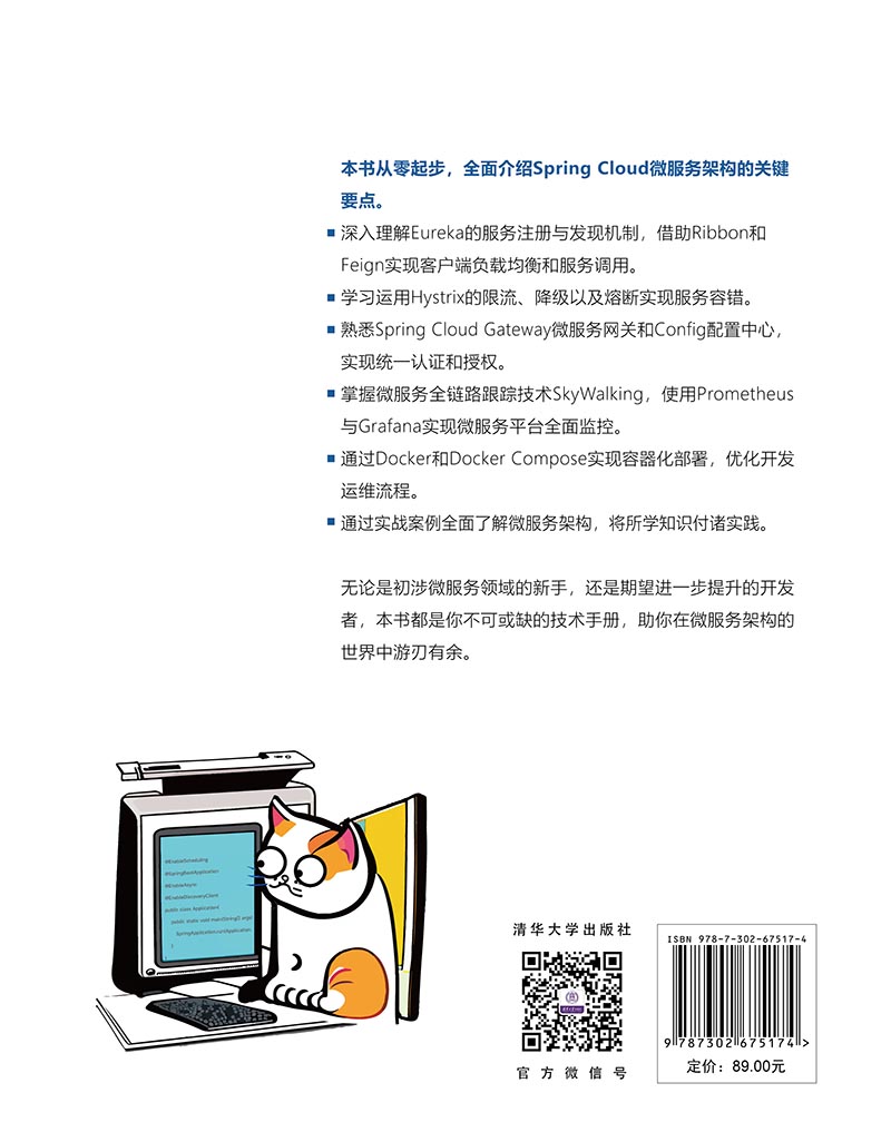 "《从零开始学Spring?Cloud微服务架构》专注于介绍Spring Cloud微服务架构,内容涵盖构建和应用微服务架构所需的关键知识和技术。《从零开始学Spring?Cloud微服务架构》共分为14章。第1~3章介绍微服务架构的发展历程、Spring Cloud概述以及使用Spring Boot构建微服务应用的实战技巧;第4~7章重点讲解Eureka服务注册与发现,Ribbon客户端负载均衡和Feign服务调用,Hystrix的限流、降级和熔断,帮助读者理解和应用微服务架构中的核心组件;第8、9章深入研究微服务网关Spring Cloud Gateway和微服务配置中心Spring Cloud Config的实现;第10~12章介绍微服务架构下的统一认证和授权、微服务全链路跟踪SkyWalking,并展示如何集成Prometheus+Grafana实现微服务监控的方法和技巧;第13、14章引导读者使用Docker和Docker Compose实现微服务容器化部署,并通过项目实战展示如何使用Spring Cloud构建图书管理系统。 《从零开始学Spring?Cloud微服务架构》适合希望学习Spring Cloud微服务、分布式系统开发与架构的开发人员和架构师阅读,同时也可以作为计算机科学、软件工程等相关专业的学生和研究人员的参考书。"