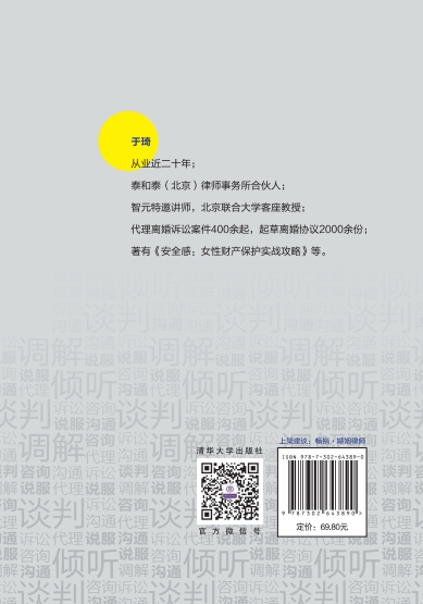 "于琦,从业近二十年;泰和泰(北京)律师事务合伙人;智元特邀讲师,北京联合大学客座教授;代理离婚诉讼案件400+,起草离婚协议2000+;著有《安全感:女性财产保护实战攻略》等。"