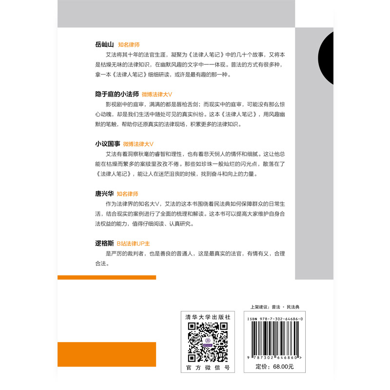 推 荐 序 经过数年打磨,好友艾法的心血之作《法律人笔记》终于问世了。因知写书不易,在收到他的作序邀请后,我立马答应下来。欣然阅毕,我不禁感慨:艾法还是那个艾法——在法官这个岗位上,他认真地做着他该做的;而回归到个人,他依旧是那个独特的他。 我一直在思考到底该怎么更好地帮助大家认识和理解这本书,思来想去,决定从三个角度分享,即这本书、这份职业、这个人。 首先可以确认的是,《法律人笔记》是一本非常优秀的普法读物。 我曾经做过一次TED演讲,在演讲中我说,法律服务对很多人来说是伪需求。什么是伪需求呢?就是你心里认为它很重要,但你却很少用到它。 比如对很多人来说,他们每年可能都会去看一两次医生,会去街边药店买几次药,但且不说每年了,他们可能一生都打不了几个官司。当你对一项服务的消费频次很低时,你自然不会对它过多关心。可回过头来你会发现,当你真的需要打官司的时候,这场官司往往对你非常重要:离婚,涉及感情与财产的重大变故,很重要,我见过太多因失败的婚姻而倾家荡产的案例;离职,涉及工作重大变故,很重要,我曾经帮月入3000元的机场司机拿到8万元的赔偿;人身意外,涉及健康乃至生命,很重要,官司没打好,自己乃至整个家庭的生活都会受到严重的负面影响。 如果你事前缺乏法律意识,那当你面临这些人生中的重大变故时,往往会在措手不及中陷入被动。 所以,到底怎样才能让大家在日常生活中关注到法律呢? 和艾法一样,我平时也会不定期在网上写一些普法文章,据我个人一点微不足道的经验,公众只会在3种情况下对法律感兴趣:第一,是自己遇到有关法律问题的时候。所以你会发现关于婚姻法、劳动法和交通肇事的...