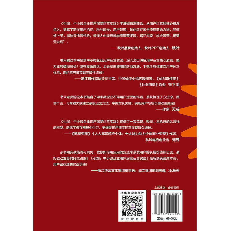 "本书是一本针对中小微企业的低成本、系统化、人人可用的用户/粉丝运营工具书,是围绕用户/粉丝的生命周期,深度挖掘赢利价值,让商业价值增长的系统方法论,也是中小微企业的创业者或者承担用户/粉丝运营职能之人从入门到精通的实践工具书。