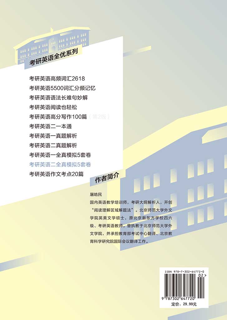 《考研英语二全真模拟5套卷》由考研英语培训师——屠皓民老师团队倾力编写,是针对研究生入学考试英语科目的备考指导用书。本书紧扣新版考研英语大纲,共五套考研英语(二)全真模拟试题,旨在帮助考生在备考冲刺阶段查缺补漏。《考研英语二全真模拟5套卷》内容包括模拟试题、答案速查、试题解析和模拟答题卡四部分。模拟试题精选真题题源文章,贴近真题难度,模拟真题版式。答案速查供考生快速检测刷题效果。试题解析从思路破解、难句突破、参考译文等维度对试题进行细致、透彻的分析,帮助考生提升英语水平和应试能力。模拟答题卡助力考生提前适应涂卡节奏,还原考场真实场景。