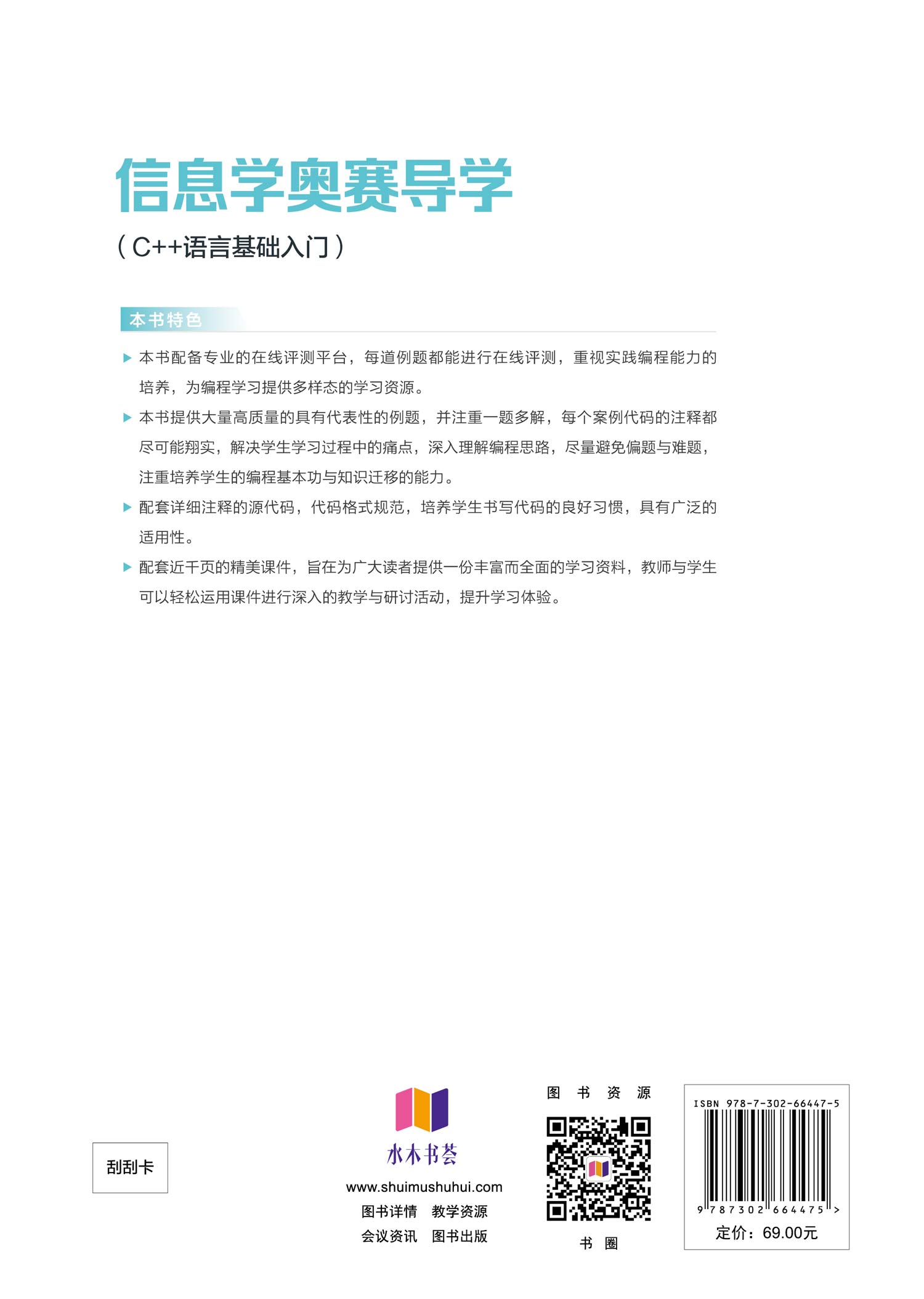 "本书是致力于零基础学习C++编程的教材,旨在为读者提供系统而全面的学习体验,包括教学课件与配套软件。全书共11章,涵盖了准备阶段、基础知识、顺序结构、选择结构、循环结构、多重循环、一维数组、多维数组、函数和结构体等方面。作者结合多年的一线教学实践,精选了200余道必做的编程例题,并逐一分析注解,确保读者能够循序渐进地掌握知识。同时精心配套了在线编程测评OJ公益网站,重视将理论知识转化为编程实践的能力。 本书适合有意参加各类编程白名单赛事的读者,特别是有计划参加C++信息学相关比赛的人群。同时,它也可以作为各类编程等级考试或认证的学生用书,以及对算法竞赛感兴趣的读者与一线教师的教学参考。 "