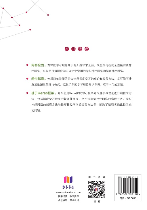 基于Keras框架。介绍使用Keras深度学习框架对深度学习理论进行编程的方法,包括深度学习程序的软硬件环境、全连接前馈神经网络的编程方法、卷积神经网络的编程方法和循环神经网络的编程方法等,解决了编程实践比较困难的问题。