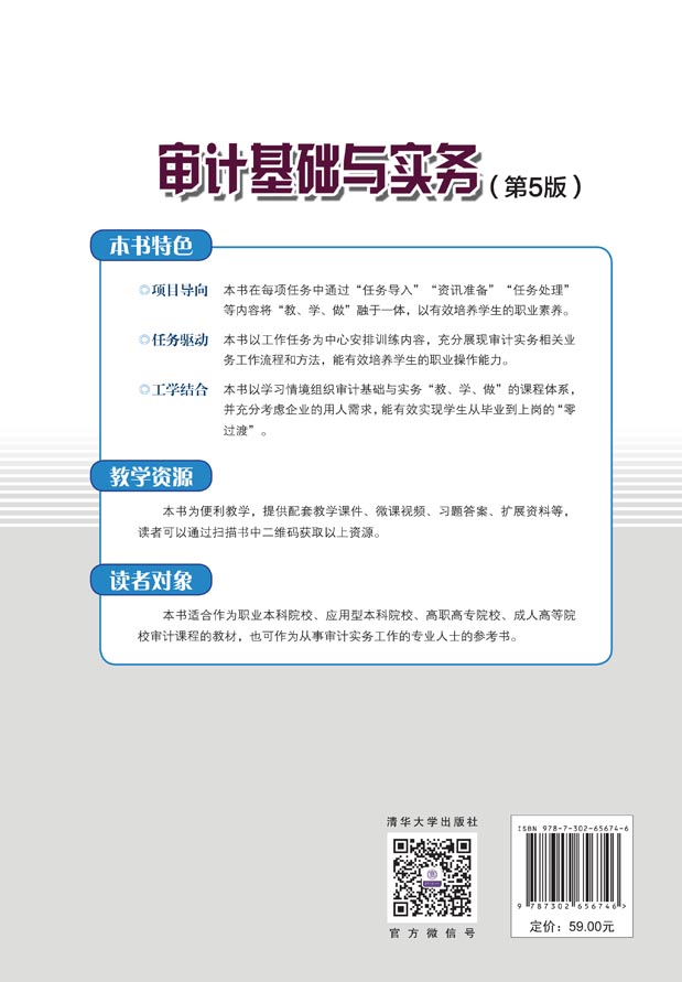 "《审计基础与实务(第五版)》被评为“十四五”职业教育国家规划教材。本书充分体现了项目导向、任务驱动、工学结合教学模式的要求,以注册会计师审计业务活动为主线,参照注册会计师审计的职业资格标准,突出职业能力培养,体现基于职业岗位分析和具体工作过程的课程设计理念。本书充分考虑了用人单位的需求,以增强学生的岗位适应能力,实现毕业与上岗的“零过渡”,力求融“教、学、做”于一体,以形成全新的符合职业教育规律和培养目标的岗位新形态教材。 《审计基础与实务(第五版)》适合作为职业本科院校、应用型本科院校、高职高专院校、成人高等院校审计课程的教材,也可作为从事审计实务工作的专业人士的参考书。 《审计基础与实务(第五版)》提供配套教学课件、微课视频、习题答案、扩展资料等,读者可通过扫描书中的二维码获取。"