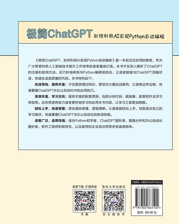 《极简ChatGPT:如何利用AI实现Python自动编程》是一本前沿且实用的教程,专为广大希望利用人工智能技术提升工作效率的读者量身打造。本书不仅深入解析了ChatGPT的注册和使用方法,还巧妙地将其与Python编程相结合,让读者能够与ChatGPT流畅对话,快速生成高质量的代码。本书特色如下: