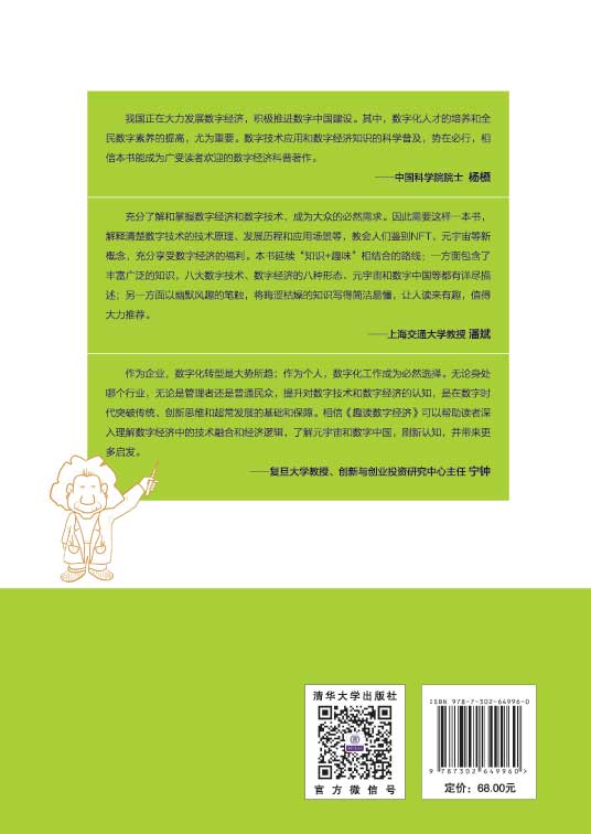 (3)内容丰富:从数字经济的数字技术基础(人工智能、区块链、交互技术、游戏引擎技术、5G/6G通信技术、物联网、云计算和大数据),到数字经济的本质和各种经济形态(平台经济、共享经济、零工经济、注意力经济、倾听力经济、网宅经济、懒人经济、无人经济),再到数字经济的上层建筑(数字政务、数字社会、数字文化和数字生态文明等),都进行了详细讲述,进而让读者对数字中国也有了较为清晰的认识。