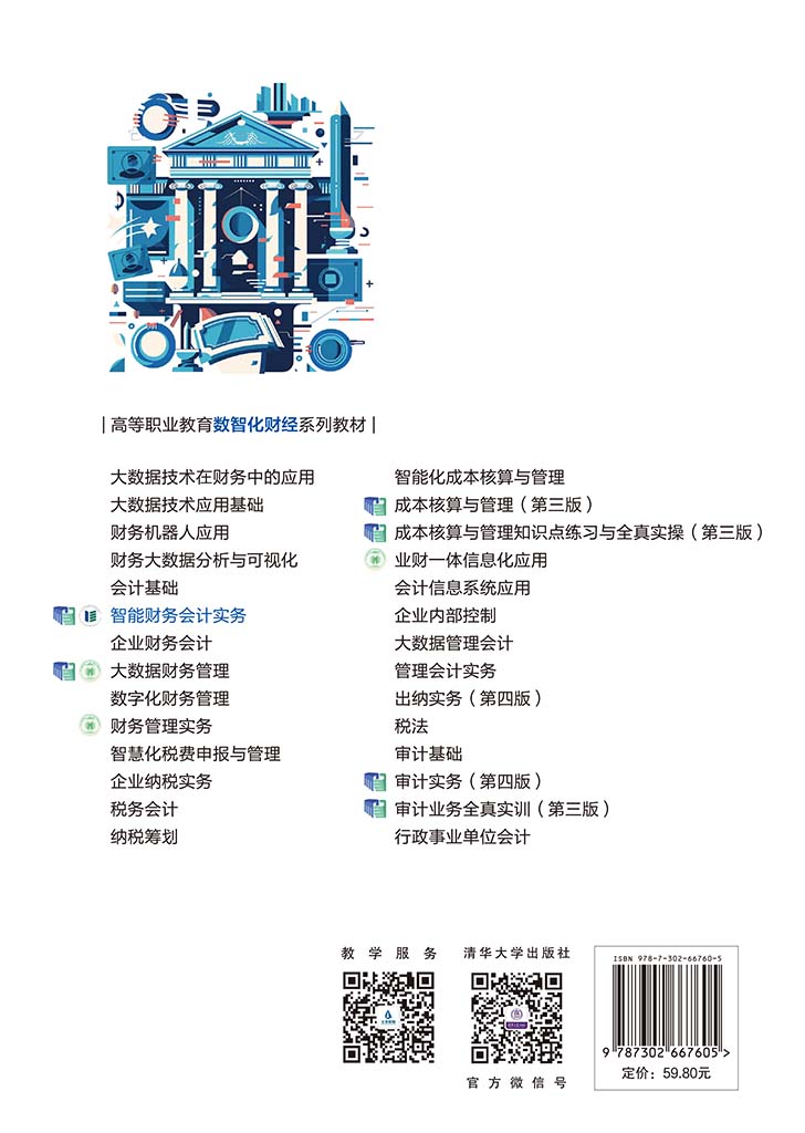 "本书是职业教育国家在线精品课程财务会计配套教材,同步建设的在线开放课程在“学银在线”“智慧职教”双平台运行,并已对接国家智慧教育公共服务平台。本书立足会计学科体系,对标会计工作标准、会计岗位能力需要,将会计理论与实践紧密结合,框架设计合理,内容系统实用。本书紧扣企业会计常见业务处理要求,贴近学生会计考证需求,既满足课堂教学与实训需要,又对接职业院校会计技能大赛,是一本“岗课赛证”融通的创新教材。本书打破传统财务会计教材边界,根据会计实务操作需要,结合各章节内容特点,较好地融入了财务云、RPA机器人等数智化新技术、新手段,为“产教融合、科教融汇”提供了探索路径。 本书配有微课、视频、动画、职业素养解读、拓展训练等数字化资源,可微信扫码视听;同时提供教学PPT、习题答案等教学资源,方便教师教学与学生自学。本书封面贴有清华大学出版社防伪标签,无标签者不得销售。"
