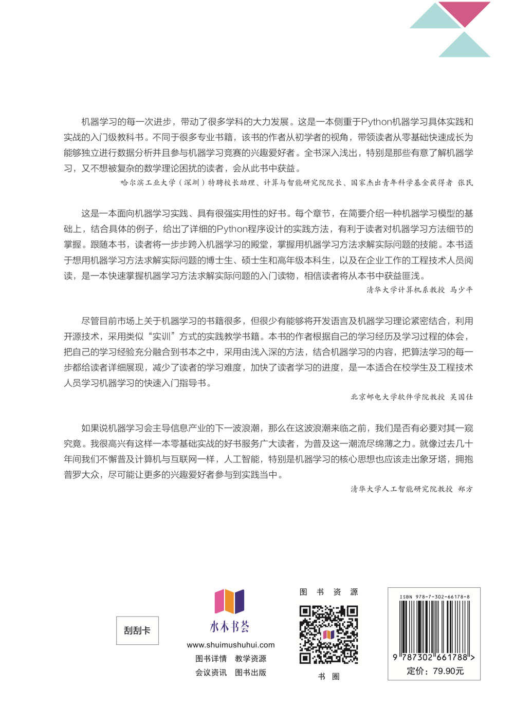 前言 自本书的第1版《Python机器学习及实践: 从零开始通往Kaggle竞赛之路》于2016年付梓以来,我始终投身于人工智能(Artificial Intelligence,AI)新产品与技术的研发领域。时隔多年,回望这段时间,我亲身感受到了人工智能理论和技术的飞速发展,几乎可以用“日新月异”一词来形容。 在这段时间里,我看到了大量承载着前沿人工智能理念和技术的次世代原型产品被孵化出来,不断刷新着人类的认知。这些典型的例子包括波士顿动力(Boston Dynamics)公司的机器人Atlas可以像人类运动员一样,实现跑步越障、后空翻和惊人的三级跳动作;OpenAI发布的聊天机器人ChatGPT能够与用户进行多轮流畅的对话、创作故事,甚至编写软件代码;DeepMind构建的AlphaGo系列对弈程序,接连战胜了多位人类顶尖围棋大师;以及国内外自动驾驶平台(如特斯拉FSD和百度Apollo)所支持的新型智能汽车陆续投入量产,等等。 同时,许多世界顶级科研人员在机器视觉、语音合成、阅读理解等人工智能的细分领域进行着不懈的理论探索。在这期间,我们不断听闻人工智能已经在这些细分领域逐渐超越人类的平均水平。这些细分的领域技术经过工程化的打磨和融合之后,又重新在一些既有的人工智能产品上给我们带来了全新的用户体验(例如,更加实时和准确的机器同声传译;或者是那些敢同真人打电话,聊天过程完全不尬,甚至还略带点儿萌腔的语音助手)。 这些新的技术进步和大量的读者来信时刻鞭策着我。许多热情洋溢的读者来信肯定了上一版书籍所给予他们的莫大帮助;同时,也有资深的前辈指出了其中的疏漏与不足。...