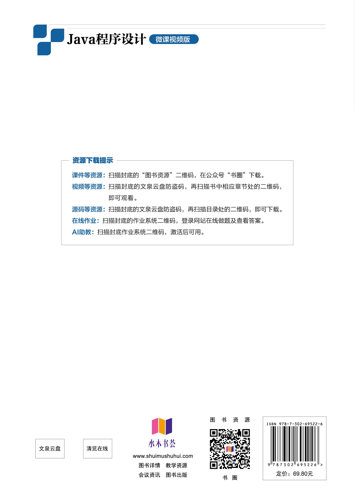 配套微课视频、AI助教、习题答案、教学课件、教学大纲、源代码等资源。提供大量编程实例、编程练习题和编程实训,提高学生解决复杂软件工程问题的能力。