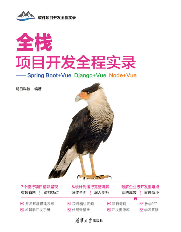 《全栈项目开发全程实录——Spring Boot+Vue Django+Vue Node+Vue》精选 7 个热门全栈项目,其中前端采用流行的 Vue.js、HTML5、CSS3、JavaScript 和 BootStrap 技术,而后端则采用 Python 的 Django Web 框架、Java 的 Spring Boot 框架和 Node.js 进行开发,实用性非常强。具体项目包含:电瓶车品牌信息管理系统、寻物启事网站、明日之星物业管理系统、吃了么外卖网、综艺之家、四季旅游信息网和电影易购 APP。本书从软件工程的角度出发,按照项目开发的顺序,系统、全面地讲解每一个项目的开发实现过程。在体例上,每章一个项目,统一采用“开发背景→系统设计→技术准备→数据库设计→各功能模块实现→项目运行→源码下载”的形式完整呈现项目,给读者明确的成就感,可以让读者快速积累实际项目开发经验与技巧,早日实现就业目标。
