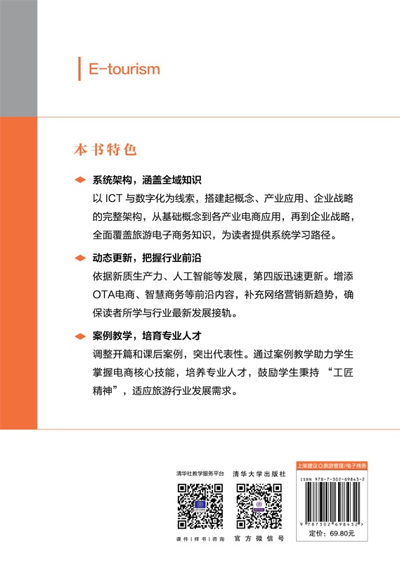 前言 自从引入了新质生产力理念以及人工智能和大数据应用,旅游电子商务犹如插上了腾飞的翅膀,为旅游新业态、新模式的发展注入了强劲的动力。与之相应,旅游学的学科理论也随着旅游电子商务学科的完善更加充实,教学实践表明,旅游电子商务已成为旅游新业态的重要组成内容。本书的修订正是在这种大环境下进行的,旨在补充第三版中存在的不足,补充了数字化、网络营销新趋势和电子商务战略相关的新内容。另外,各章节的内容也进行了相应的完善和补充。例如,在旅行社电子商务部分,增加了在线服务商(online travel agency, OTA)的电子商务内容,在饭店电子商务部分,补充了以数字化为基础的智慧商务内容;在交通电子商务部分,新增了无票旅行和移动支付的概念;尤其对饭店、旅行社、景区、目的地等的电子商务战略作用部分进行了调整。 在修订过程中,我们特别强调了“工匠精神”,即追求学科的卓越和精益求精的态度。我们在每一个细节上都力求做到最好,确保内容的准确性和系统性,使读者能够从中获得最大的收益和启发。通过这种精益求精的态度,本书在内容上有了创新和补充。另外,本书对每章后面的扩展知识内容也做了补充,期望读者通过课外材料和网络资源进一步了解更多的扩展知识。我们也希望旅游业通过数字化,结合本地的旅游资源和产品,借助电子商务形成强劲的以旅游业为主导的首发经济。通过本课程的学习,旅游管理专业的学生能够在未来无处不在的电子商务环境中,根据自己掌握的知识适应并开展工作,成为掌握电子商务核心技能的旅游知识工作者,并在职业生涯中践行“工匠精神”,不断追求自己的卓越与创新。 第四版的修订基本保持前三版的架构内容,以 IC...
