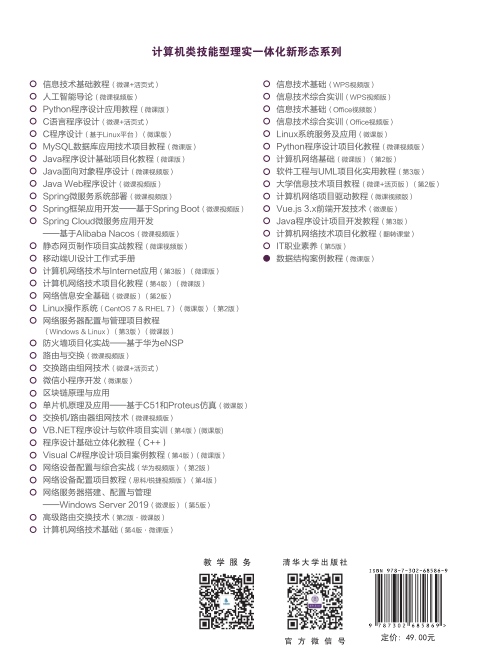 前 言 “数据结构”是计算机程序设计的重要理论基础,包含数据的逻辑结构、存储结构和 相应操作,理论性较强。“数据结构”又是一门实践性很强的课程,主要培养学生分析数据、 组织数据的能力,从而使学生能够编写出效率高、结构完整的程序。在软件工程开发和实 施过程中能否正确、灵活地运用数据结构的思想设计出解决问题的算法,是检验“数据结 构”课程学习效果的重要标准。 目前市面上有很多版本的“数据结构”教材,这些教材大多采用串讲的方式组织理论 知识,即“提出概念—解释概念—举例说明”,这种形式虽然简单明了,却不能很好地结 合实际应用来讲解理论知识,并不符合高职院校学生从具体实例开始再到一般认知的学习 过程,导致学生很难理解数据结构在程序设计过程中的重要作用。此外,这些教材基本采 用C或C++语言作为数据结构和算法的描述语言,偏向于基础应用。 本书弥补了上述数据结构教材的缺陷,注重培养学生的实践能力,在传授理论知识的 同时遵循“实用优先、循序渐进、理实结合、全面提升”的原则,同时以实践案例为中心 组织课程内容,将知识点融入真实案例中。本书共8章,每章的内容都按照勤学—善询— 笃行的总体思路呈现。勤学篇包含基础知识和基础题目;善询篇包含头脑风暴和反馈;笃 行篇包含实践项目和能力拓展。本书引导学生从了解案例需求开始,有针对性地准备相应 知识,通过案例分析将知识点与实际应用相融合,从而设计实现案例效果,最后对整个过 程进行总结,达到提高能力和加深理解的目的。 本书第1章为初识数据结构,主要介绍数据结构的相关术语、学习数据结构的意义、 算法的度量等...