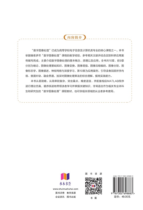 "“数字图像处理”已成为高等学校电子信息及计算机类专业的核心课程之一。本书依据编者多年“数字图像处理”课程的教学经验,参考相关文献并结合实际科研应用案例编写而成,主要介绍数字图像处理的基本概念、原理以及应用。全书共10章,前9章分别为绪论、图像处理基础知识、图像变换、图像增强、图像压缩编码、图像分割、图像形态学、图像描述、神经网络与深度学习,第10章为应用案例,引导读者回顾所学内容、查漏补缺、融会贯通,加深对图像处理算法的综合理解,提高实践能力。 本书从易到难,从简单到复杂,突出重点,难度适宜,并配备相应MATLAB程序进行理论仿真,循序渐进地带领读者学习并掌握关键知识,非常适合作为相关专业本科生和研究生的“数字图像处理”课程教材,也可供相关领域的从业者参考使用。 "
