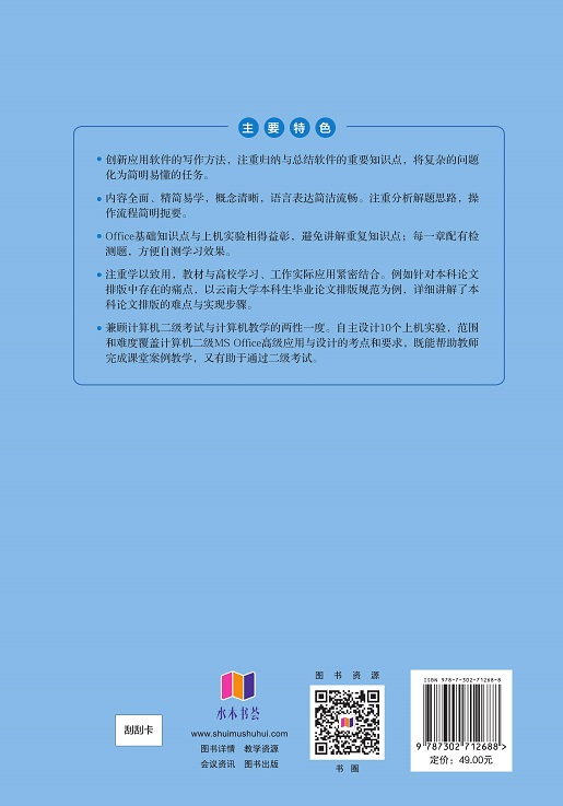 教材分为两篇,第一篇 Office办公软件,包括Word2016,Excel2016,PowerPoint2016,二级公共基础高频考点,包括计算机系统、数据结构与算法、程序设计、软件工程、数据库应用。第二篇 上机实验,包括9个上机实验:实验一 Word排版综合应用,实验二 制作贺卡,实验三 用邮件合并制作工资条、邀请信,实验四长文档的排版。实验五 Excel公式与函数,实验六 Excel综合应用一,实验七 Excel综合应用二,实验八 PowerPoint基本应用 实验九 PowerPoint 综合应用。 本教材特色是,注重体现启发式教学。有些计算机教材只列出知识点的基本操作步骤,没有分析设计思路,不利于自主学习与思辨能力的培养。本教材分析问题、概括解决问题的思路,将知识点融入典型例题,简明扼要,用典型案例驱动教学。 本教材面向二级MS Office高级应用与设计考试,兼顾Office高频考点与二级公共基础知识,设计有难度的综合性案例,提升课程的创新性、综合性与挑战度,便于开展任务驱动式教学,提高教学互动性。学生只要按照教材的操作提示,即可高效掌握Office软件高级应用与设计。 即可作为计算机基础教材,也可作为二级考试培训教材。