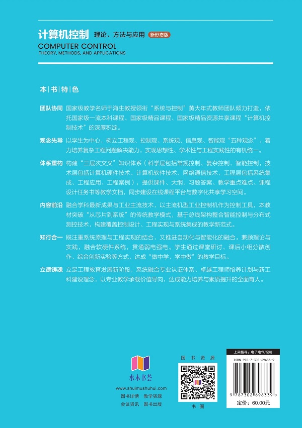 "本书基于计算机、控制系统、人工智能、网络通信与电子信息等技术的发展,利用教育界、科技界和工业界所取得的成果,针对新工科建设、工程教育专业认证和卓越工程人才培养,以培养学生解决复杂工程和实际问题的综合能力为出发点,以主流机型PC/ISA/PCI/PCI-E总线工业控制机、PC系列计算机和嵌入式计算机为控制工具,以计算机控制的理论、方法与应用为目标,系统地阐述了计算机控制系统的基本原理、设计技术和工程实现。 全书共9章:第1章是绪论,介绍计算机控制系统及其组成、典型型式、发展概况和趋势;第2章介绍自动控制理论基础,包括控制系统概述、连续时间控制系统、离散时间控制系统;第3章讨论常规及复杂控制技术;第4章讨论智能控制技术;第5章讨论计算机控制系统的硬件设计技术;第6章讨论计算机控制系统的软件设计技术;第7章讨论分布式测控网络技术;第8章讨论计算机控制系统的设计原则、步骤和工程实现,并给出了设计实例。书中各章配有习题可供选用。全书内容丰富,体系新颖,理论联系实际,实践性、工程性、系统性和集成性强。"