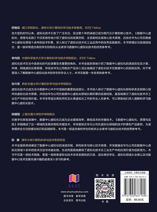 "本书以数据中心面临的各行业数字化转型需求和业务挑战为切入点,详细介绍了数据中心虚拟化架构全景和新一代虚拟化技术体系,帮助读者掌握理论知识和实践方法。首先,本书概述数据中心虚拟化的基本特征、发展历史、主要功能和认识误区,帮助读者快速地对数据中心虚拟化有一个初步的了解。随后,本书介绍数据中心虚拟化的总体架构和技术方案的演进,并分别阐述数据中心基础设施虚拟化的三大组成部分:计算虚拟化、存储虚拟化和网络虚拟化的实现方式和基本原理。在基础设施层之上,本书对典型数据中心虚拟化系统的其他服务层次和组成模块进行了深入浅出的讲解,包括超融合基础架构数据中心、新兴虚拟化技术(容器和云原生)、数据中心的安全与可靠性、数据中心管理平台的设计等内容。在大数据和智能时代,数据中心越来越聚焦于对数据的高效处理,并逐渐向算力中心演进。本书还对AI算力池化做了一些阐述,包括虚拟化统一开源框架和开放XPU算力生态相关的内容。最后,以华为数据中心虚拟化解决方案在多个关键行业的应用为例,完整展示了从技术选型、架构设计、产品组件到实现效果的端到端实践经验,启发读者活学活用数据中心虚拟化技术。 本书可以为构建轻量弹性、敏捷高效、安全可靠的新一代数据中心基础设施提供参考和帮助,适合企业和科研院所信息化部门及数据中心的技术人员阅读,也可为高等院校计算机相关专业的师生提供参考。 "
