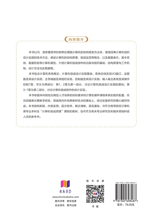 本书依据本科院校应用型人才培养的目标要求和计算机硬件课程体系的组织配置,总结编者长期的教学经验,借鉴国内外经典教材的优点,反复研究、精心编写。本书结构新颖、内容实用、层次有序、概念清晰、语言通俗,可作为高等院校计算机类专业本科生“计算机组成原理”课程的教材,也可作为有关专业研究生和相关领域科技人员的参考书。