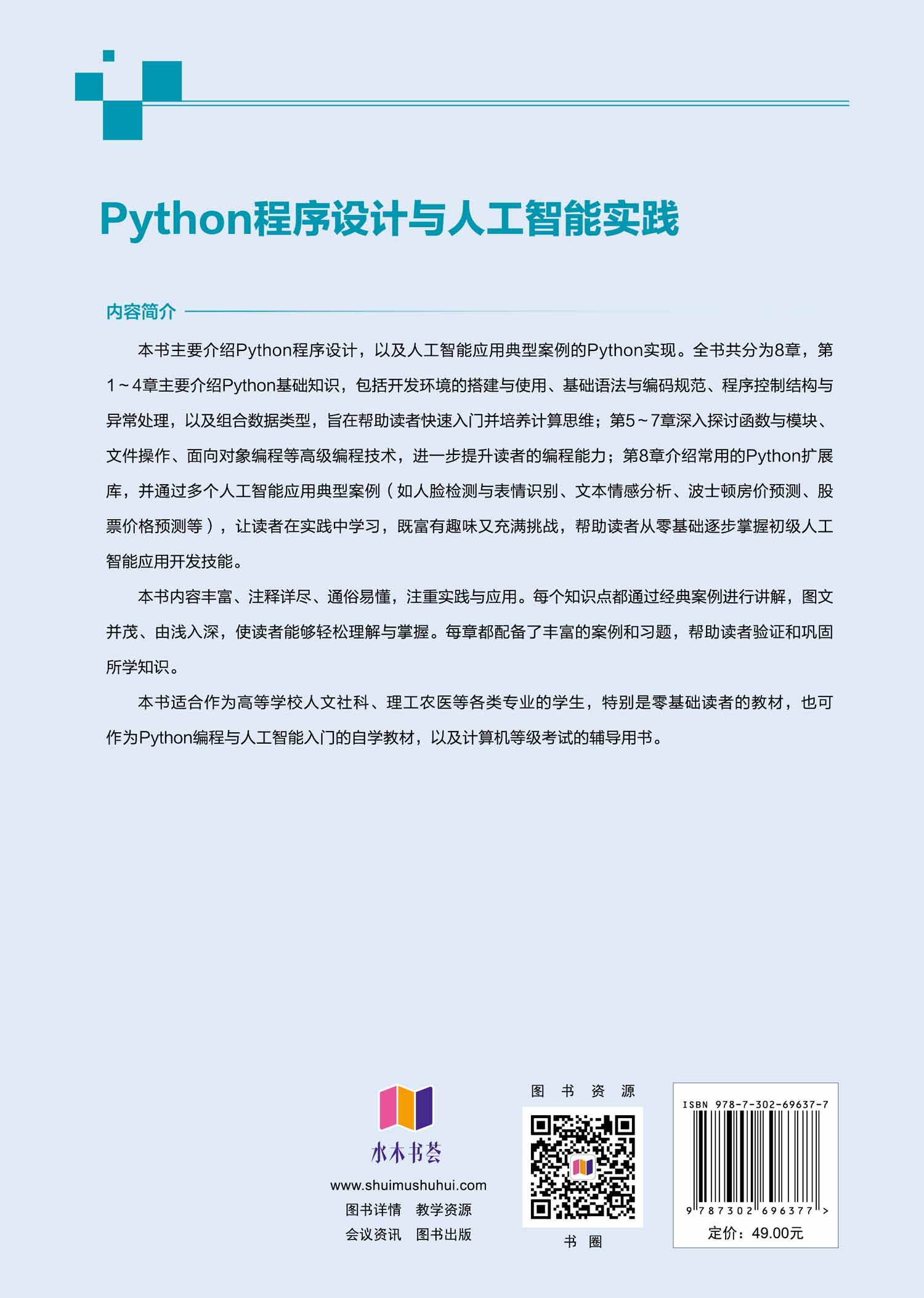 本书主要介绍Pyhton程序设计,以及人工智能应用典型案例的Python实现,全书共分为8章,内容丰富、注释详尽、通俗易懂,注重实践与应用。每个知识点都通过经典案例进行讲解,图文并茂、由浅入深,使读者能够轻松理解与掌握。每章都配备了丰富的案例和习题,帮助读者验证和巩固所学知识。