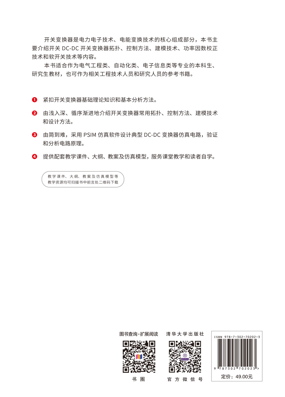 (2) 由浅入深、循序渐进地介绍开关变换器常用拓扑、控制方法、建模技术和设计方法。