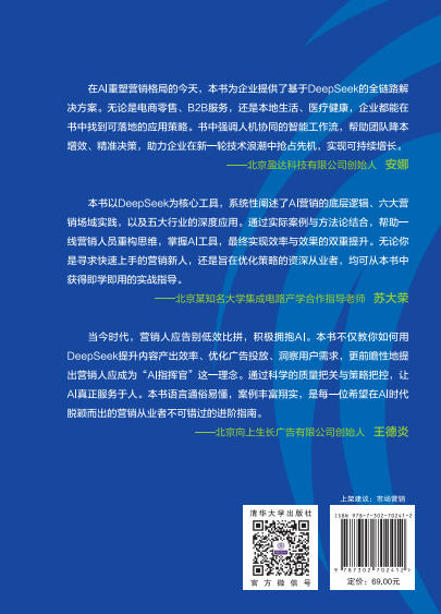 "本书系统介绍了DeepSeek驱动的智能营销战略,助力企业找到新的增长路径。本书分为上、中、下三篇:上篇从营销新武器、思维进化、玩转DeepSeek三个方面,介绍AI营销底层逻辑、营销人的思维进化、DeepSeek操作基础等内容;中篇聚焦六大营销场景实战,包括精准用户洞察、广告投放优化、数据驱动决策等,提供即学即用的方法;下篇则讲述具体的营销方法,涵盖电商零售B2B业务、本地生活等行业。 除了包含丰富的理论,本书还讲解了DeepSeek在不同场景、行业的实战案例,提供了多种方法,助力企业营销决策者、数字营销从业者、媒体从业者等人群重构营销思维,掌握先进的营销工具,驱动业绩增长。"